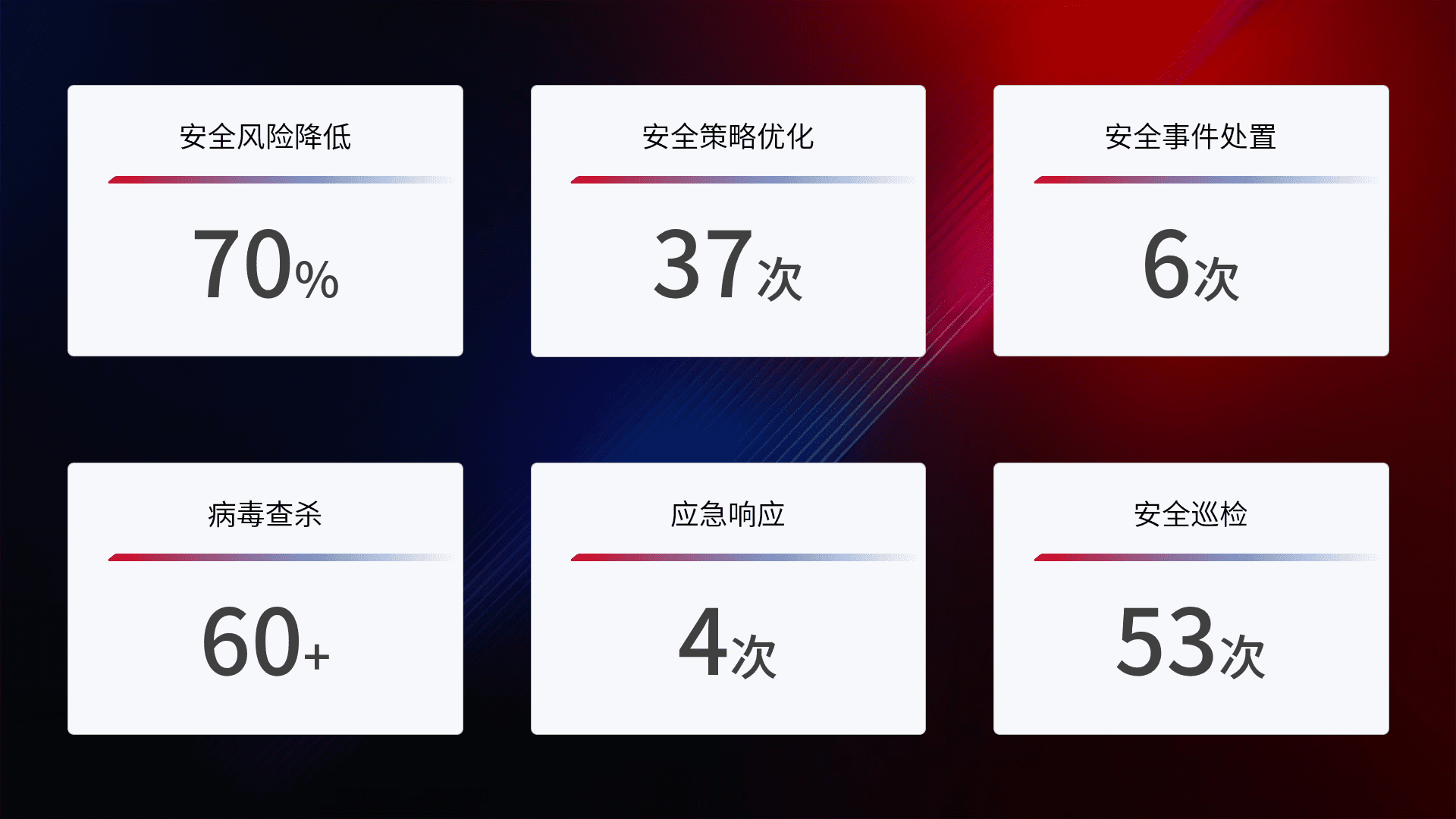 提供全面的安全事件报告体系,,,包括处置报告、、、、周报、、、季度和年度总结,,结合持续监控,,,帮助客户深入了解网络安全状况。。。